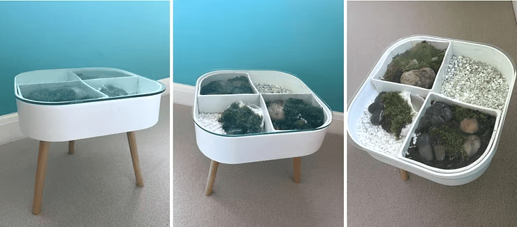Prototype moss table: recycled table, ceramic, commissioned glass, repurposed gravel, found stones and moss.