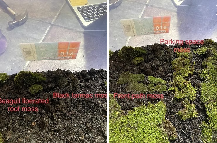 I made a mobile moss collecting unit and a home moss incubator. The tennis courts were about to be ‘cleared’ so this moss was rescued.